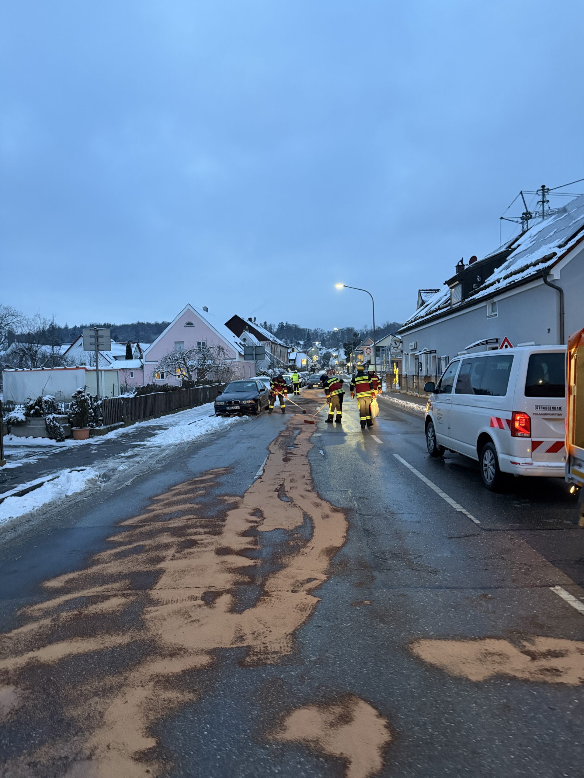Bei einem PKW waren Betriebstoffe ausgelaufen. Diese verteilten sich auf ca. 200 Meter Länge, fast über die komplette Fahrbahnbreite.