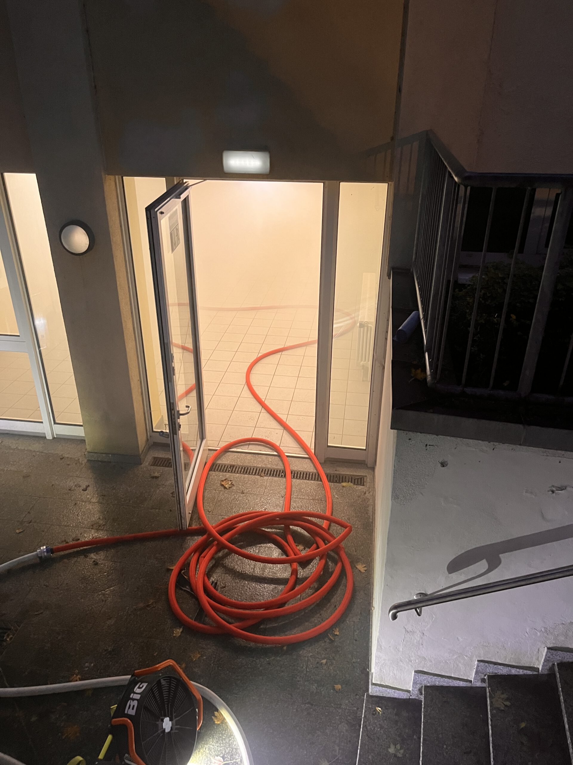 Das Übungsszenario war ein Kellerbrand in einer Schule mit massiver Rauchentwicklung in die Treppenhäuser und somit auch in die Fluchtwege der Schüler.